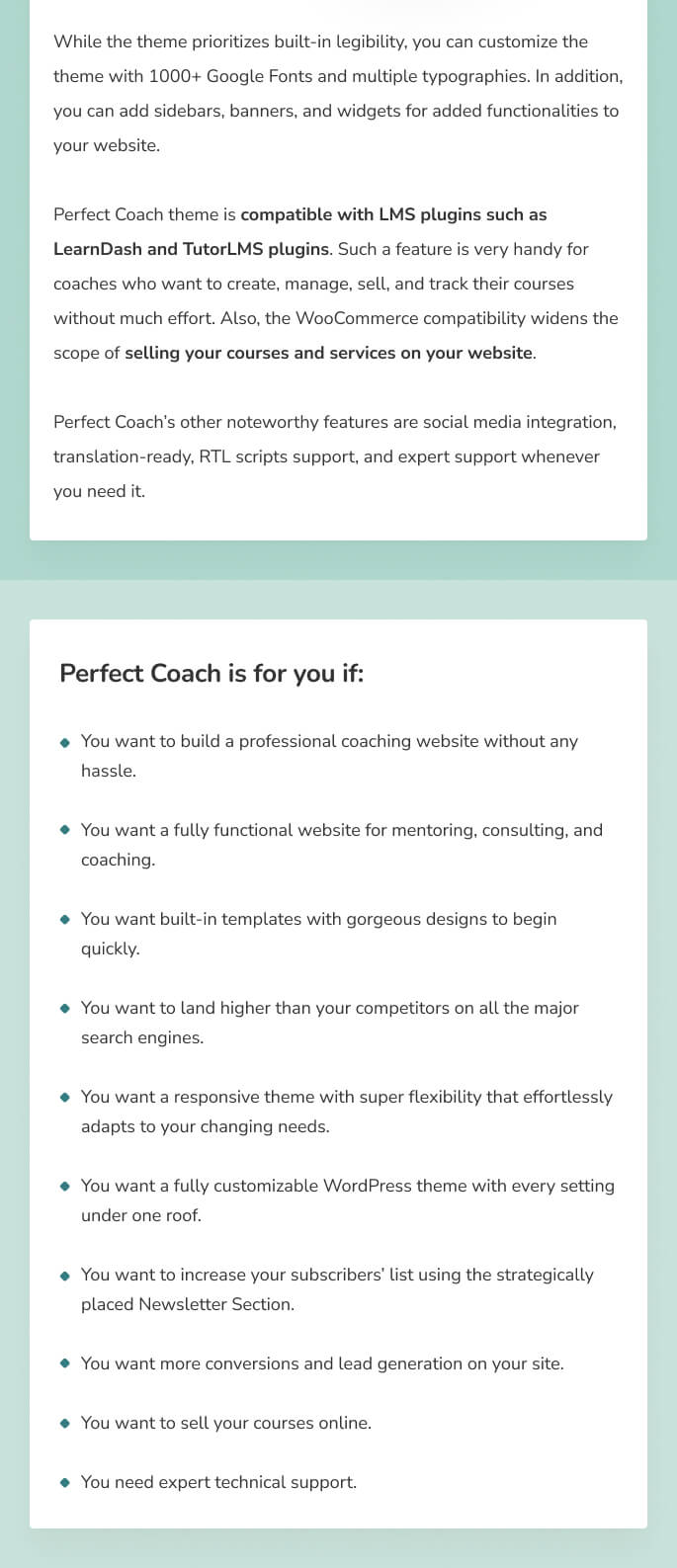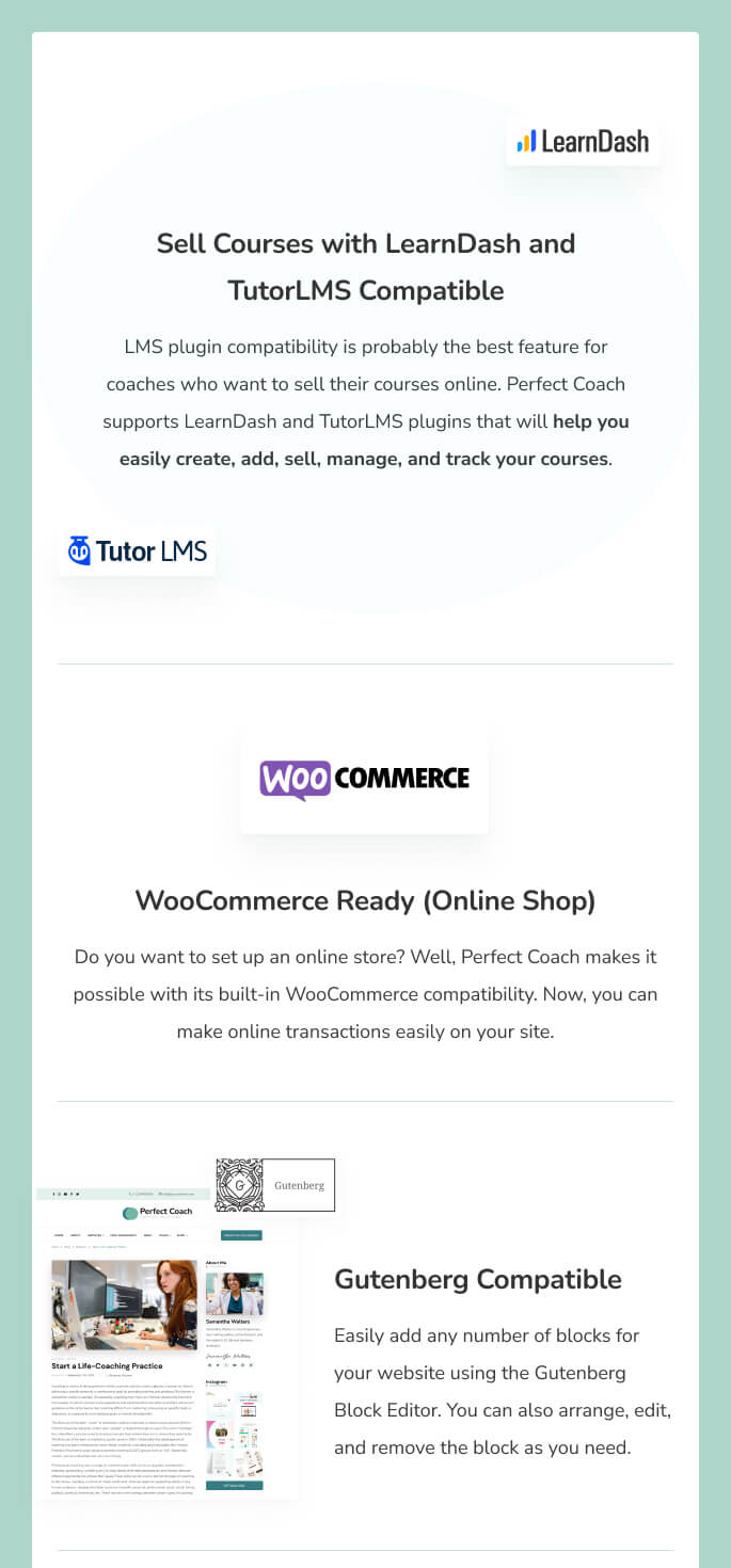 Perfect Coach theme is compatible with LMS plugins such as LearnDash and TutorLMS plugins. Such a feature is very handy for coaches who want to create, manage, sell, and track their courses without much effort. Also, the WooCommerce compatibility widens the scope of selling your courses and services on your website.