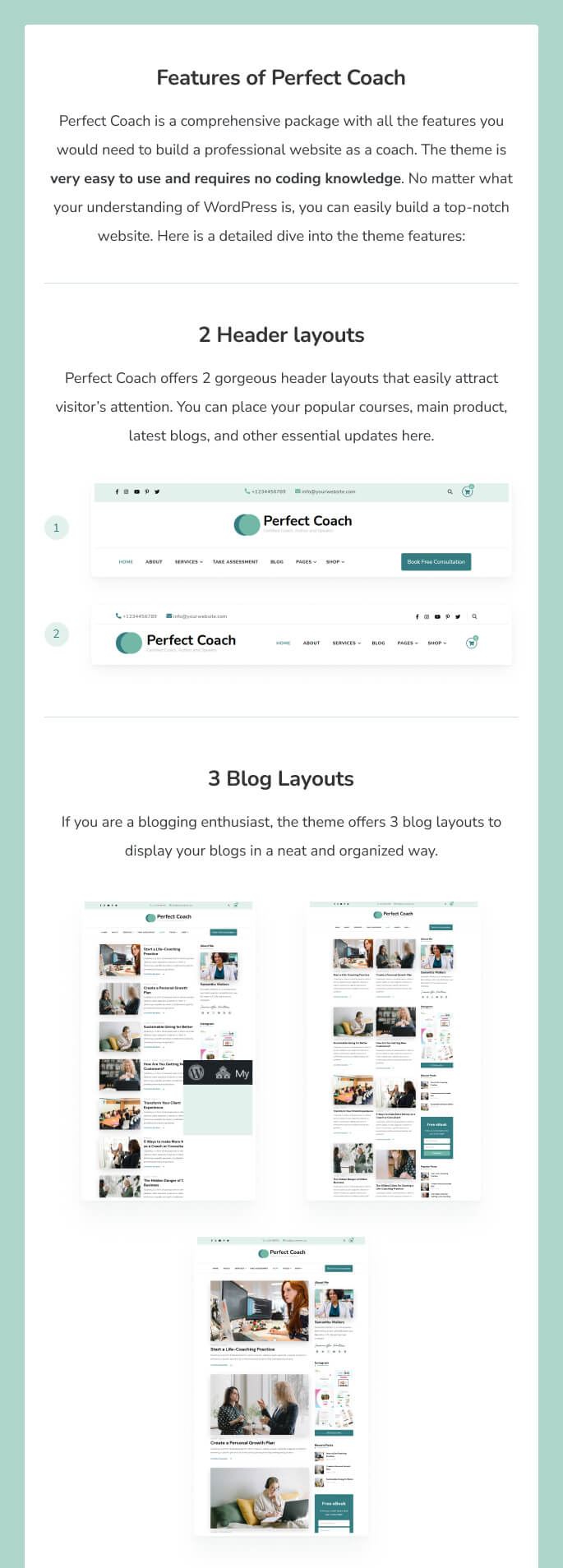 Perfect Coach is a comprehensive package with all the features you would need to build a professional website as a coach. The theme is very easy to use and requires no coding knowledge. No matter what your understanding of WordPress is, you can easily build a top-notch website. Here is a detailed dive into the theme features:
