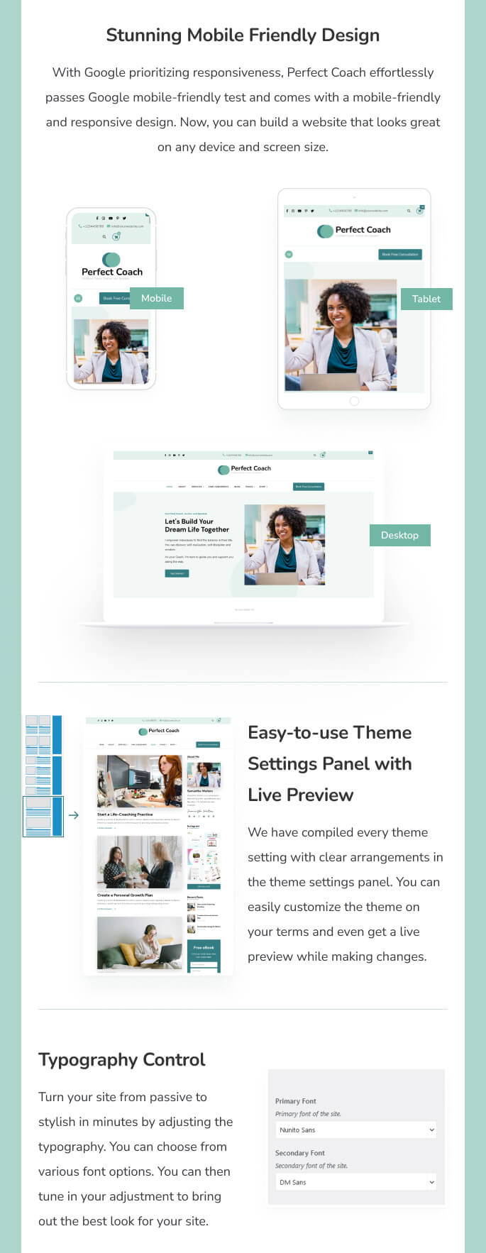 With Google prioritizing responsiveness, Perfect Coach effortlessly passes Google mobile-friendly test and comes with a mobile-friendly and responsive design. Now, you can build a website that looks great on any device and screen size.