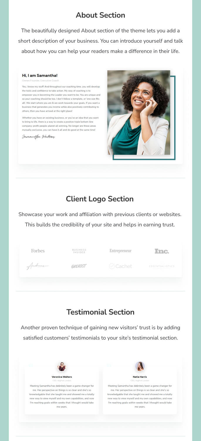 The beautifully designed About section of the theme lets you add a short description of your business. You can introduce yourself and talk about how you can help your readers make a difference in their life.