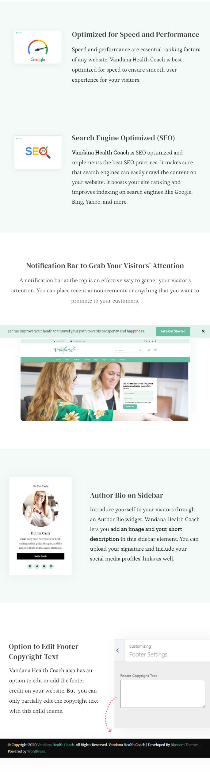 Vandana Health Coach also has an option to edit or add the footer credit on your website. But, you can only partially edit the copyright text with this child theme.