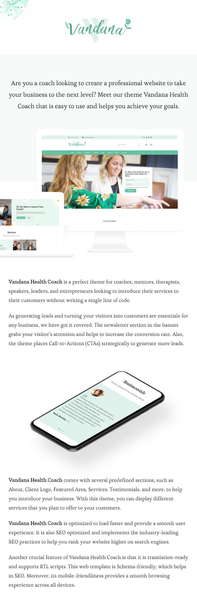 Vandana Health Coach is a perfect theme for coaches, mentors, therapists, speakers, leaders, and entrepreneurs looking to introduce their services to their customers without writing a single line of code.