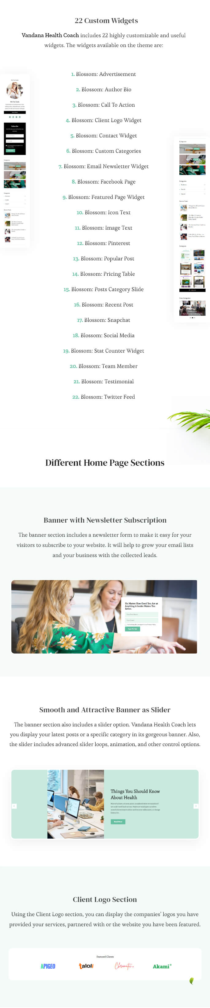 Vandana Health Coach includes 22 highly customizable and useful widgets. The widgets available on the theme are:
