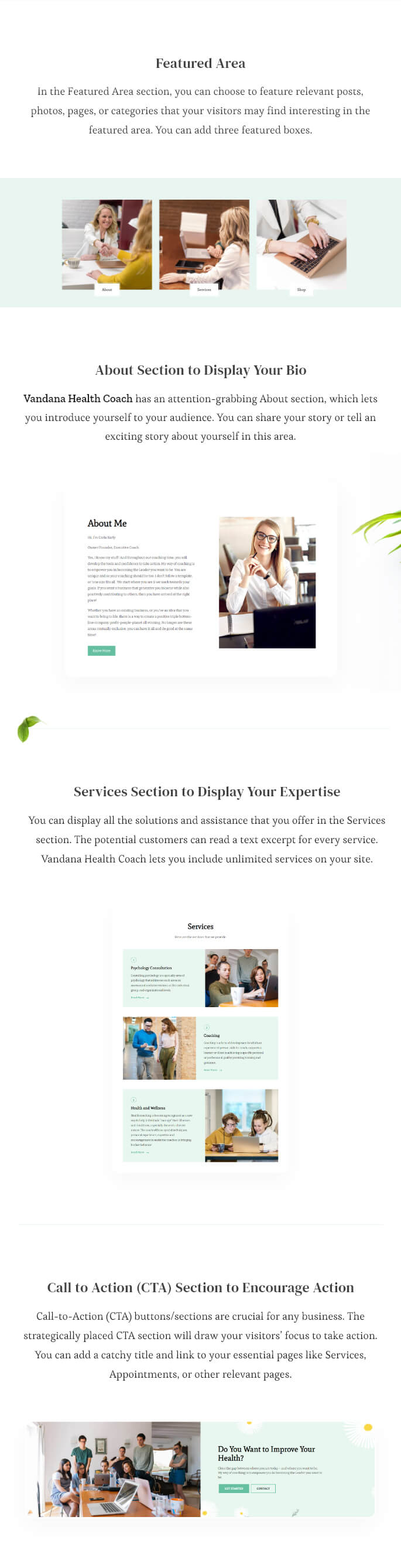 Vandana Health Coach includes several sections on the homepage to create a perfect website to introduce yourself and your business.
