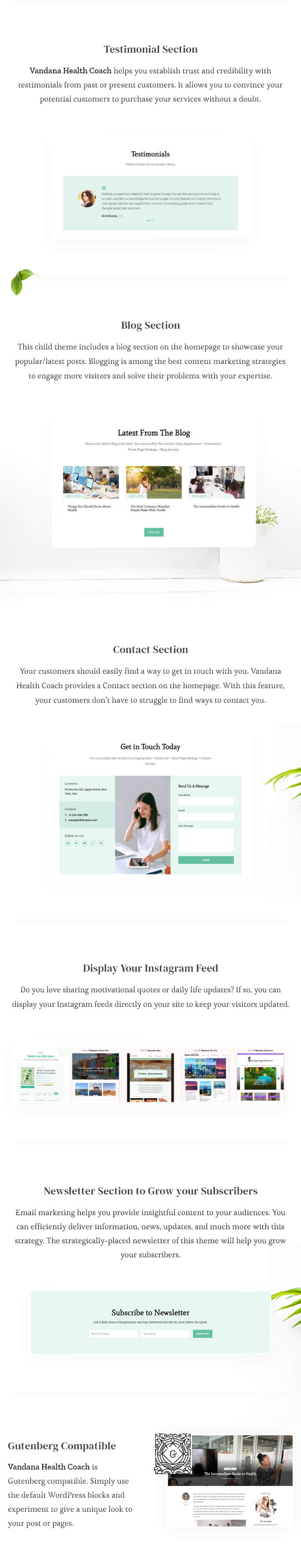 Vandana Health Coach is Gutenberg compatible. Simply use the default WordPress blocks and experiment to give a unique look to your post or pages.