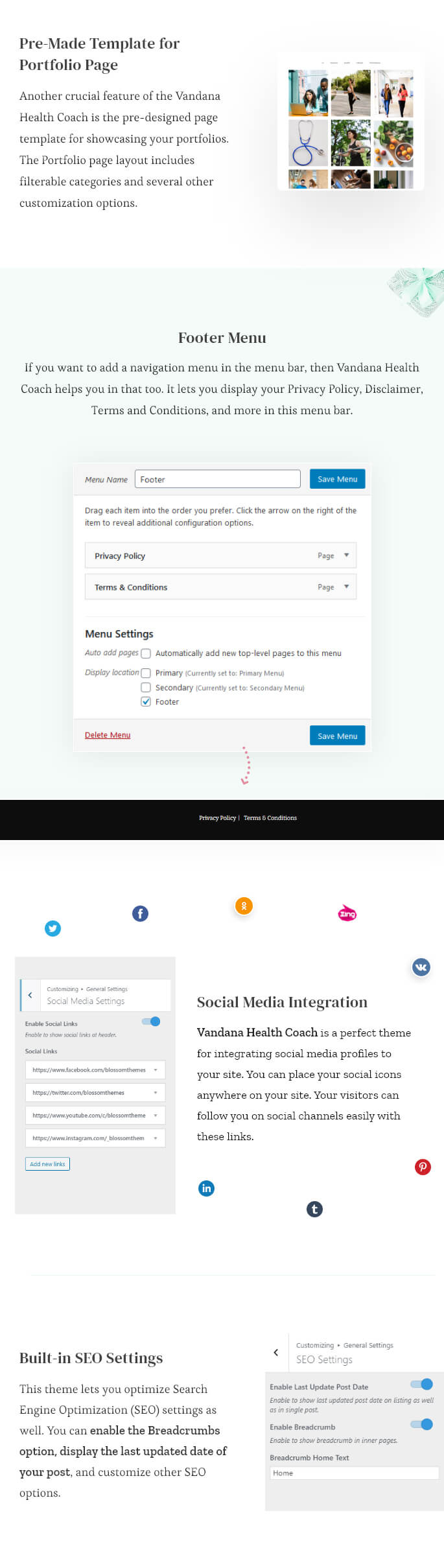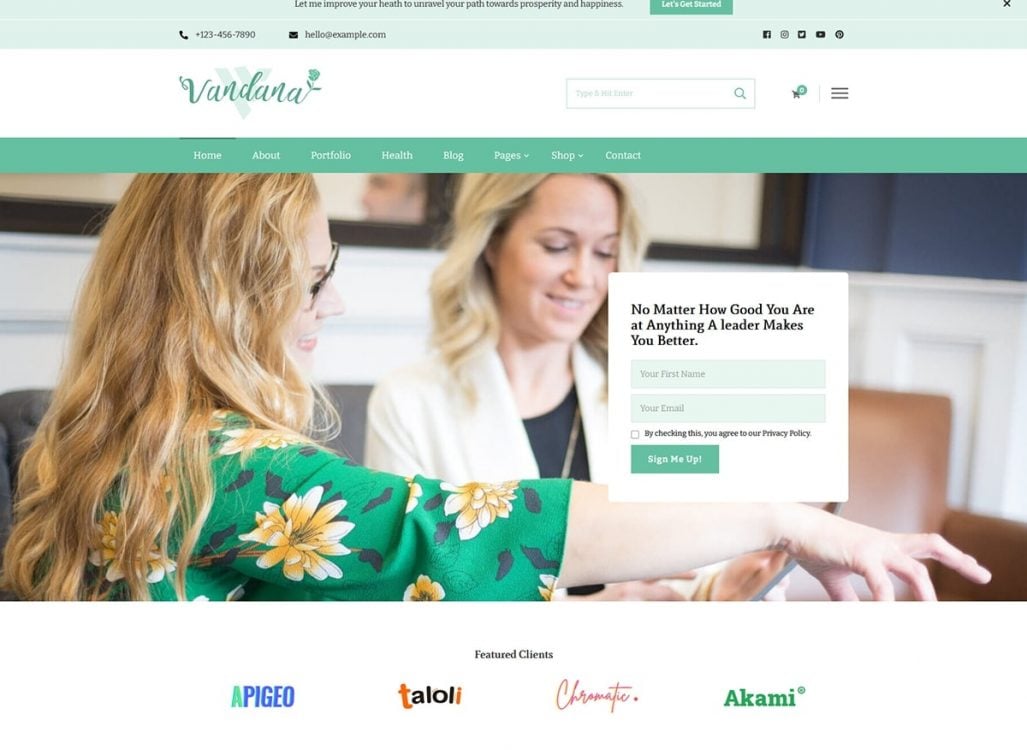 Vandana Health Coach is a perfect theme for integrating social media profiles to your site. You can place your social icons anywhere on your site. Your visitors can follow you on social channels easily with these links.