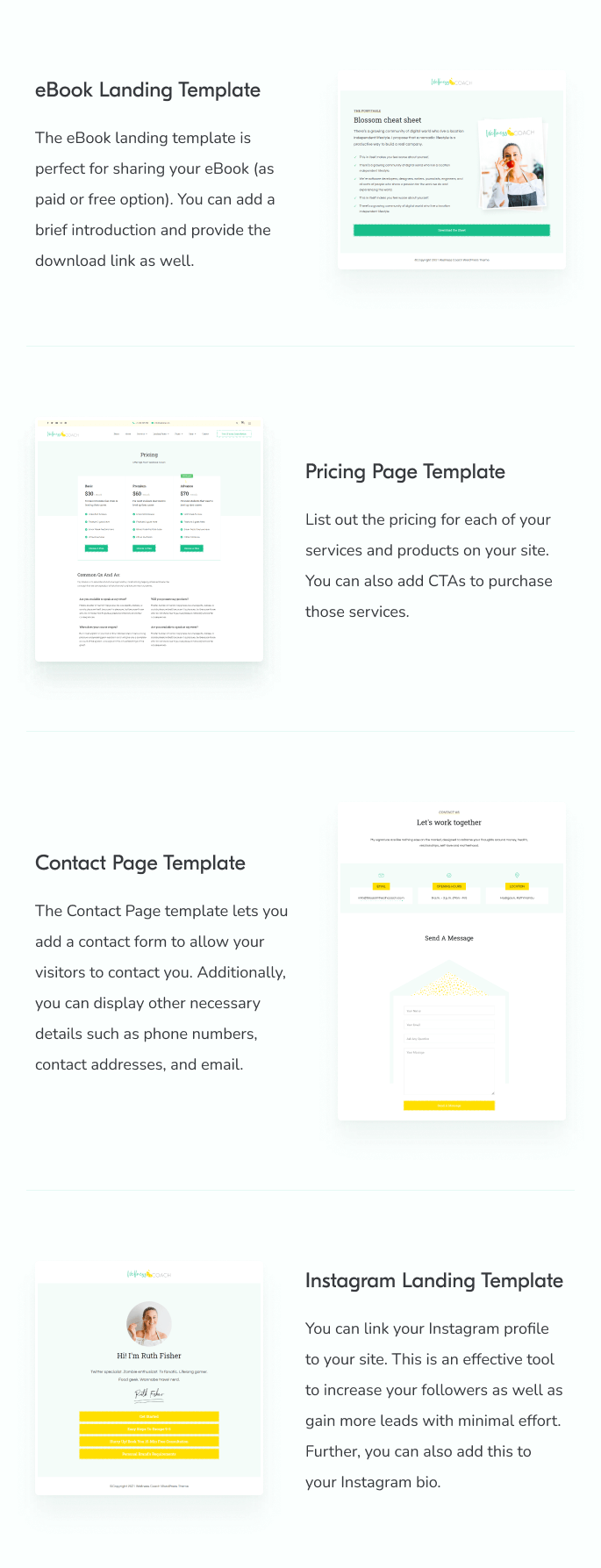 If you are a health coach, mentor, therapist, entrepreneur and even motivational speaker, you will love the Wellness Coach theme.