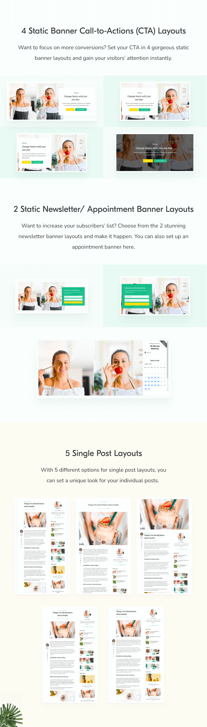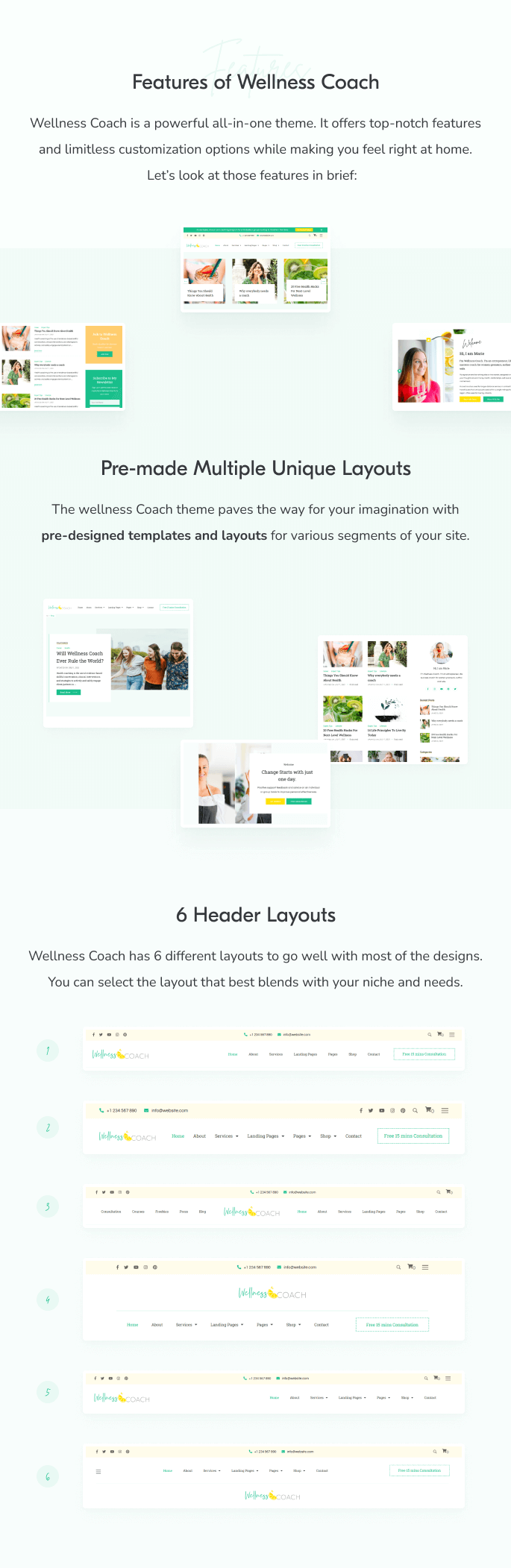 Wellness Coach has 6 different layouts to go well with most of the designs. You can select the layout that best blends with your niche and needs.