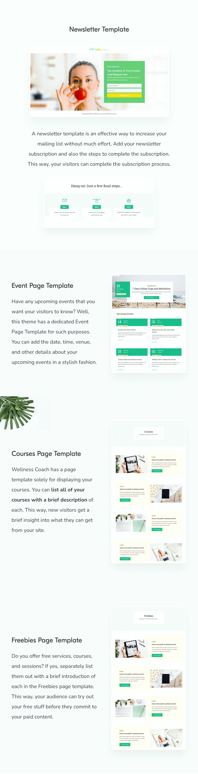If your priority is lead generation, Wellness Coach has your back. It comes with multiple strategically-placed newsletter sections with CTAs to grow your email list.