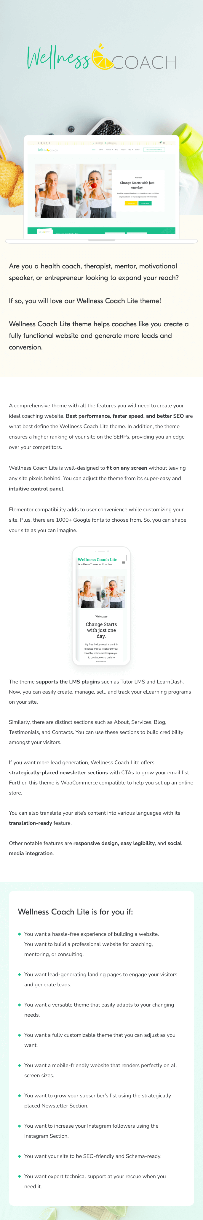 Wellness Coach Lite theme helps coaches like you create a fully functional website and generate more leads and conversion.