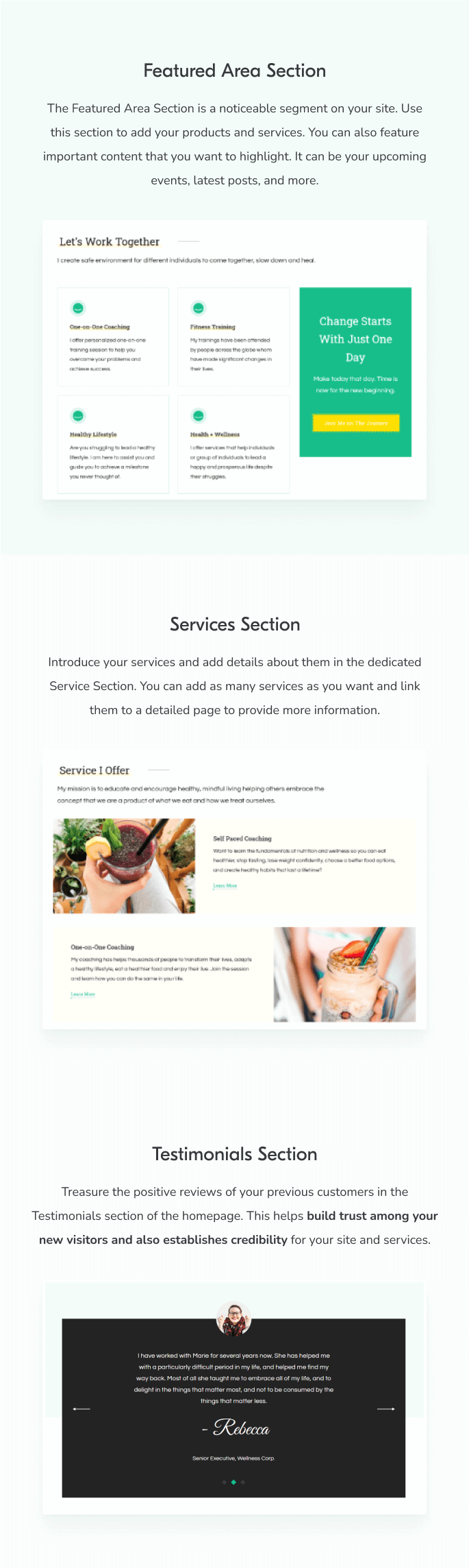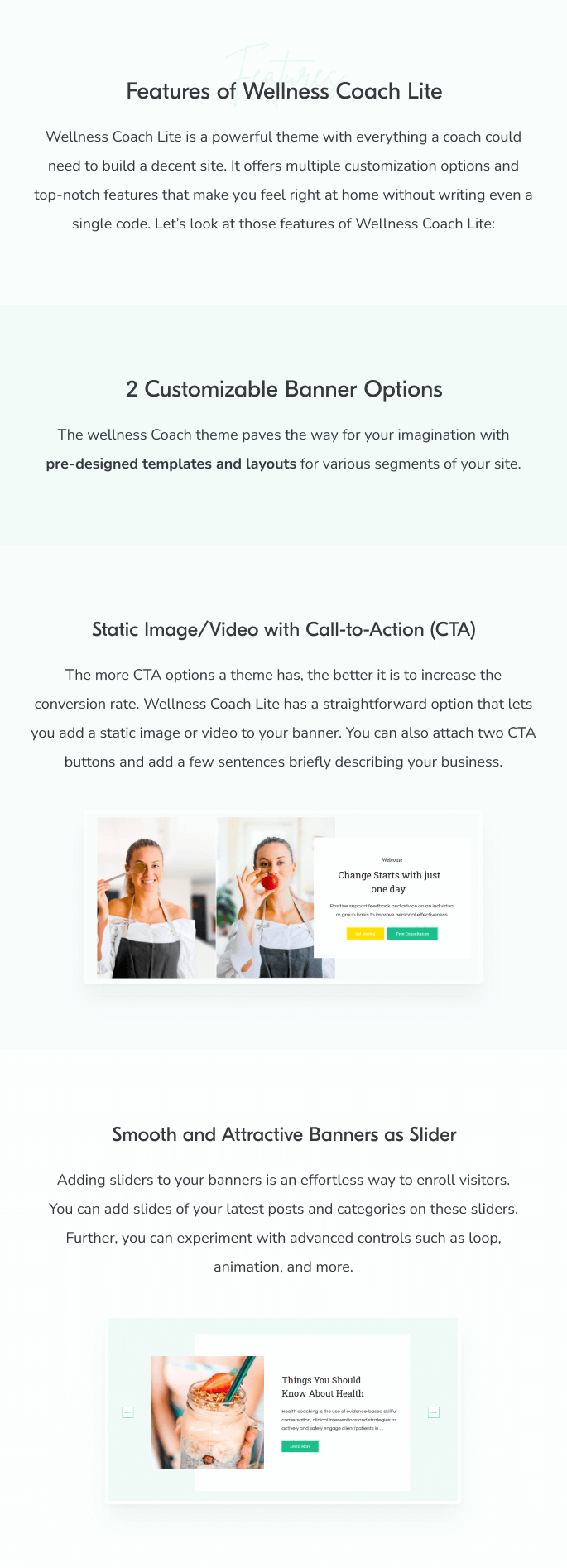 The more CTA options a theme has, the better it is to increase the conversion rate. Wellness Coach Lite has a straightforward option that lets you add a static image or video to your banner. You can also attach two CTA buttons and add a few sentences briefly describing your business.