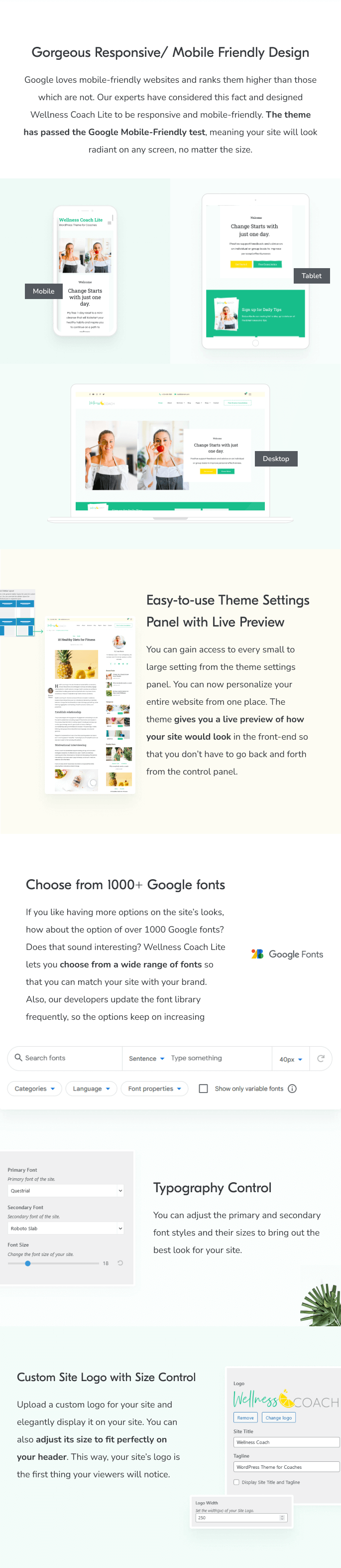 If you like having more options on the site’s looks, how about the option of over 1000 Google fonts? Does that sound interesting? Wellness Coach Lite lets you choose from a wide range of fonts so that you can match your site with your brand. Also, our developers update the font library frequently, so the options keep on increasing.