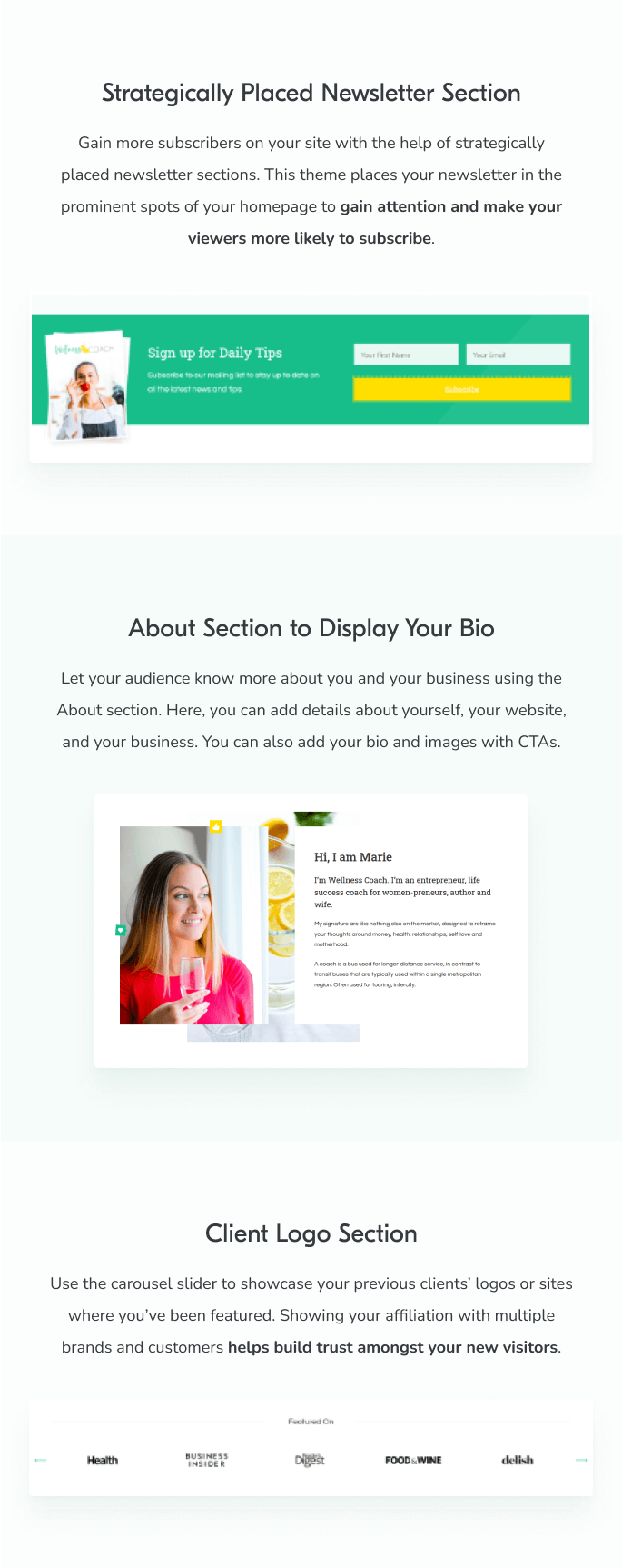 If you want more lead generation, Wellness Coach Lite offers strategically-placed newsletter sections with CTAs to grow your email list. Further, this theme is WooCommerce compatible to help you set up an online store.