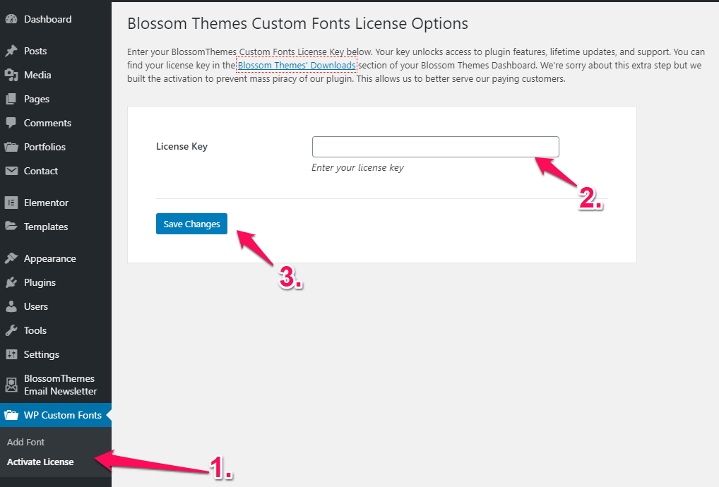 After the plugin is installed and activated, go to WP Custom Fonts > Activate License. The license key is provided along with your purchase receipt. You can also find it under your Blossom Themes account.