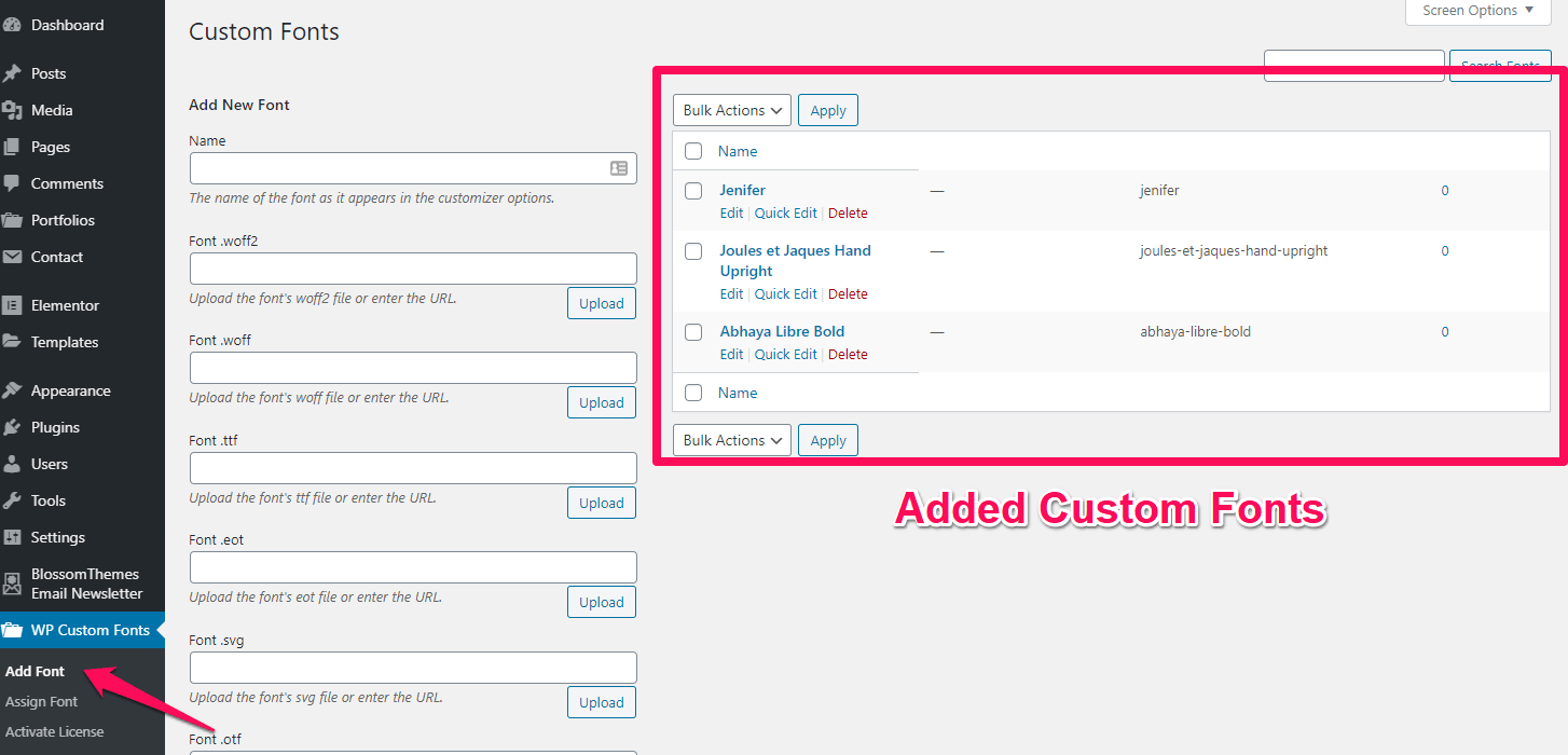 Now, to add your custom fonts, click on Add Font. Here, you can upload different font files. Add the font name, click on the upload button of the font type, and upload the font. After that, click on the Add New Font button.