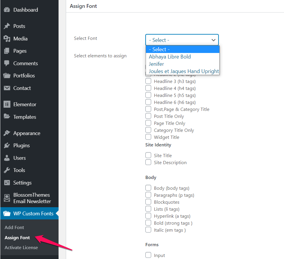 In addition to this, you can also overwrite and assign fonts to different HTML elements. You can find this option under the Assign Fonts option.