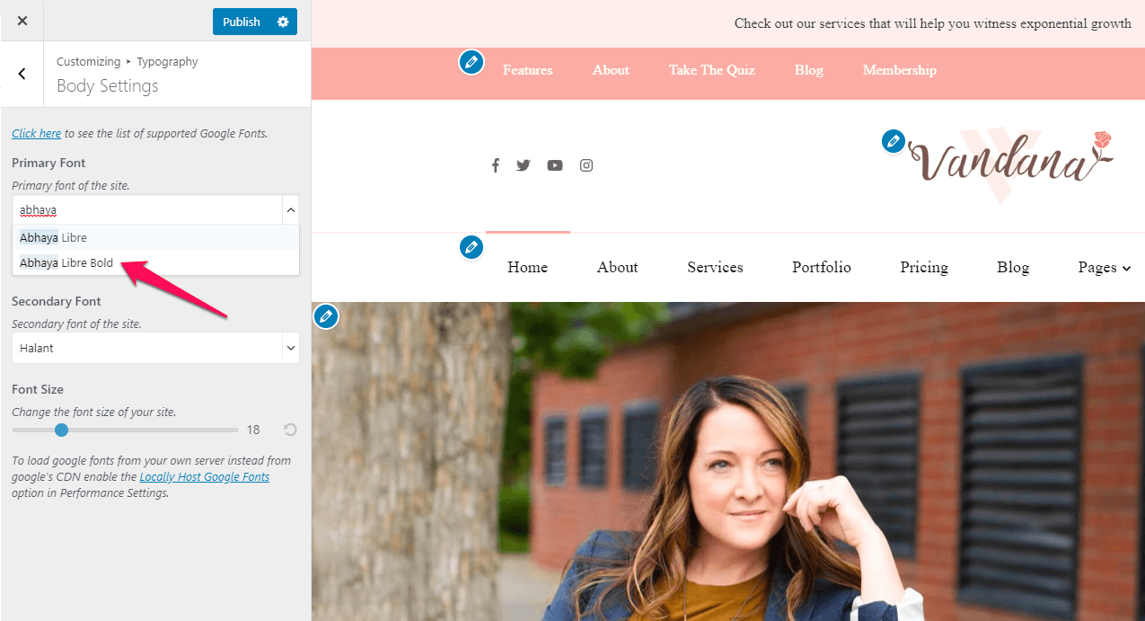After the font has been uploaded successfully, you can find the custom fonts in the drop-down list of Typography settings.