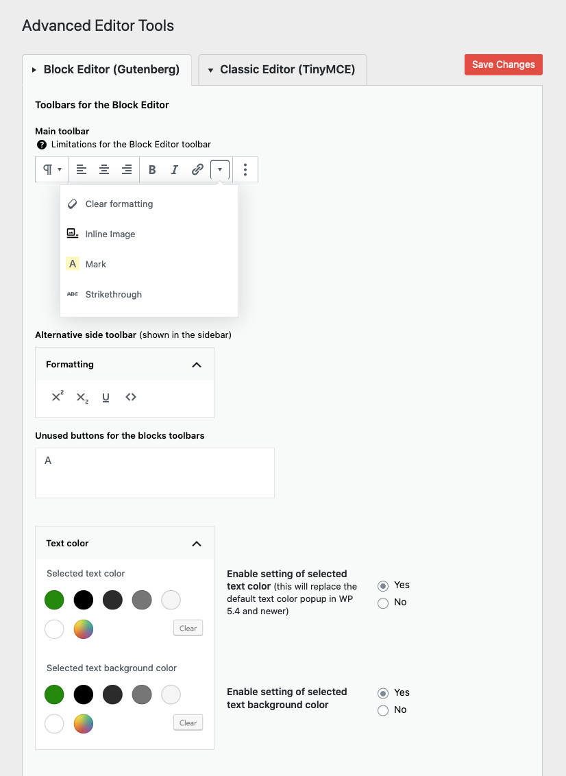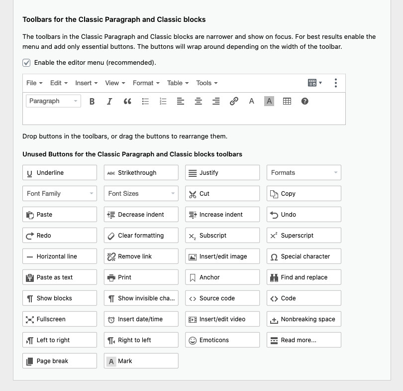 As always this plugin will let you add, remove and arrange the buttons that are shown on the Visual Editor toolbar in the Classic Paragraph and Classic blocks in the block editor, and in the classic editor (when enabled by a plugin). There you can configure up to four rows of buttons including Font Sizes, Font Family, text and background colors, tables, etc.