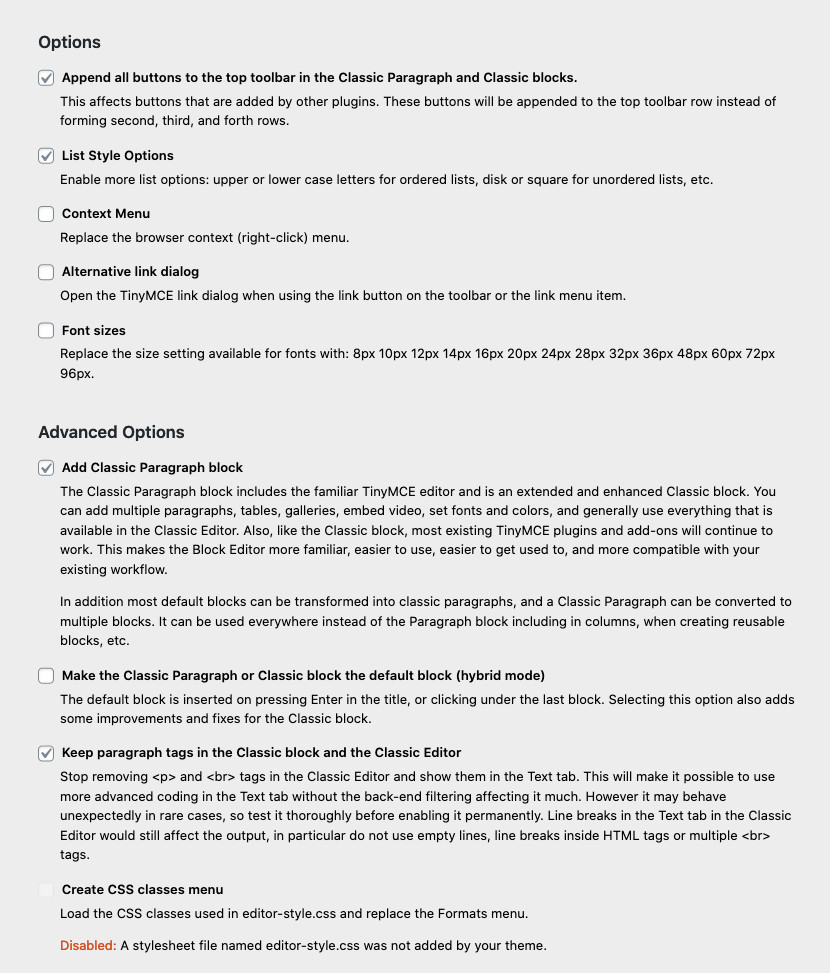 In addition this plugin adds options for keeping the paragraph tags in text mode and importing the CSS classes from the theme’s editor-style.css.