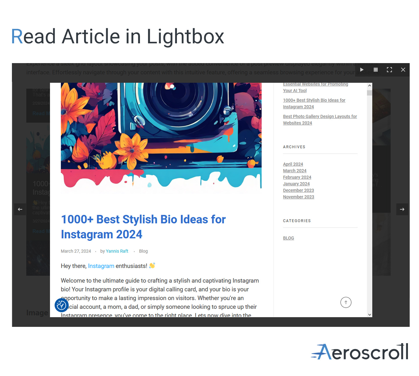 - Display Article in Lightbox: Enhance your photo gallery or post grid by allowing users to read articles within a lightbox, keeping them engaged without navigating away from the gallery.