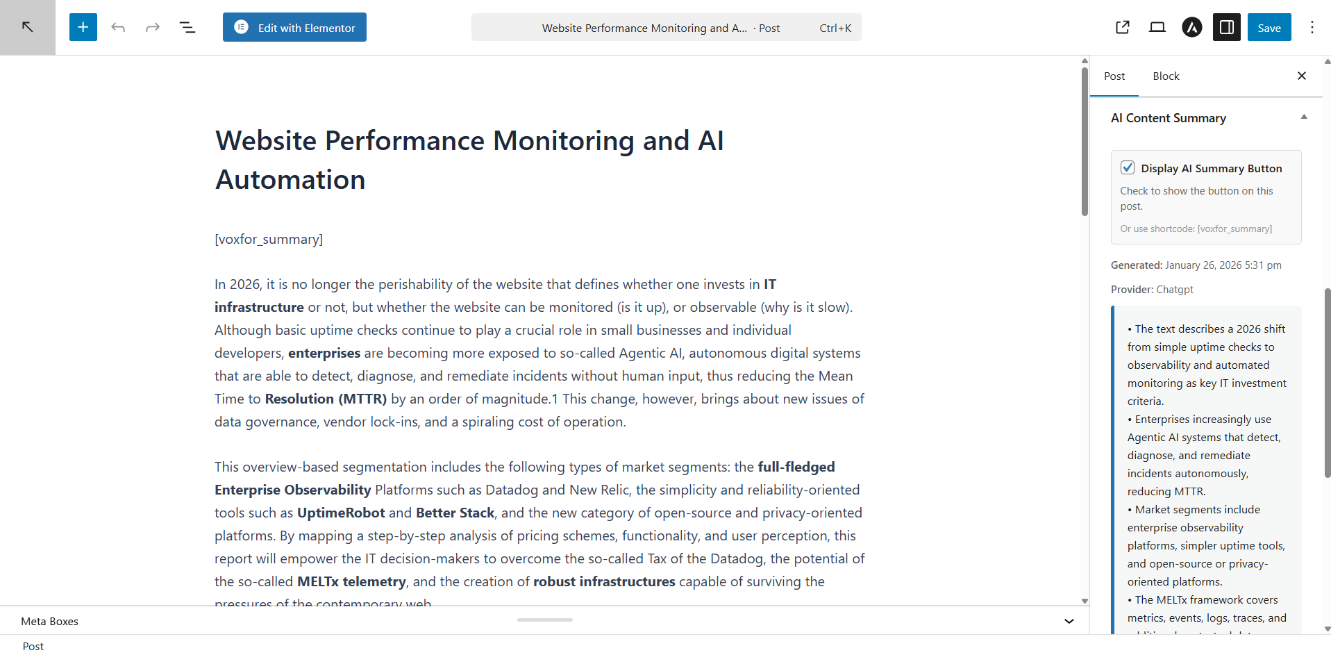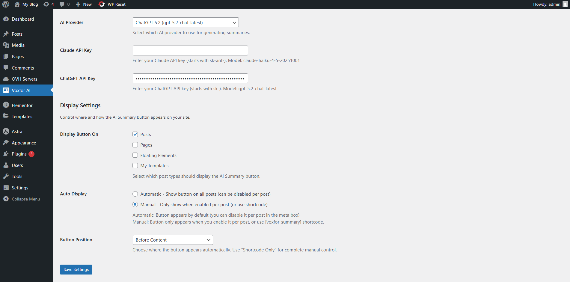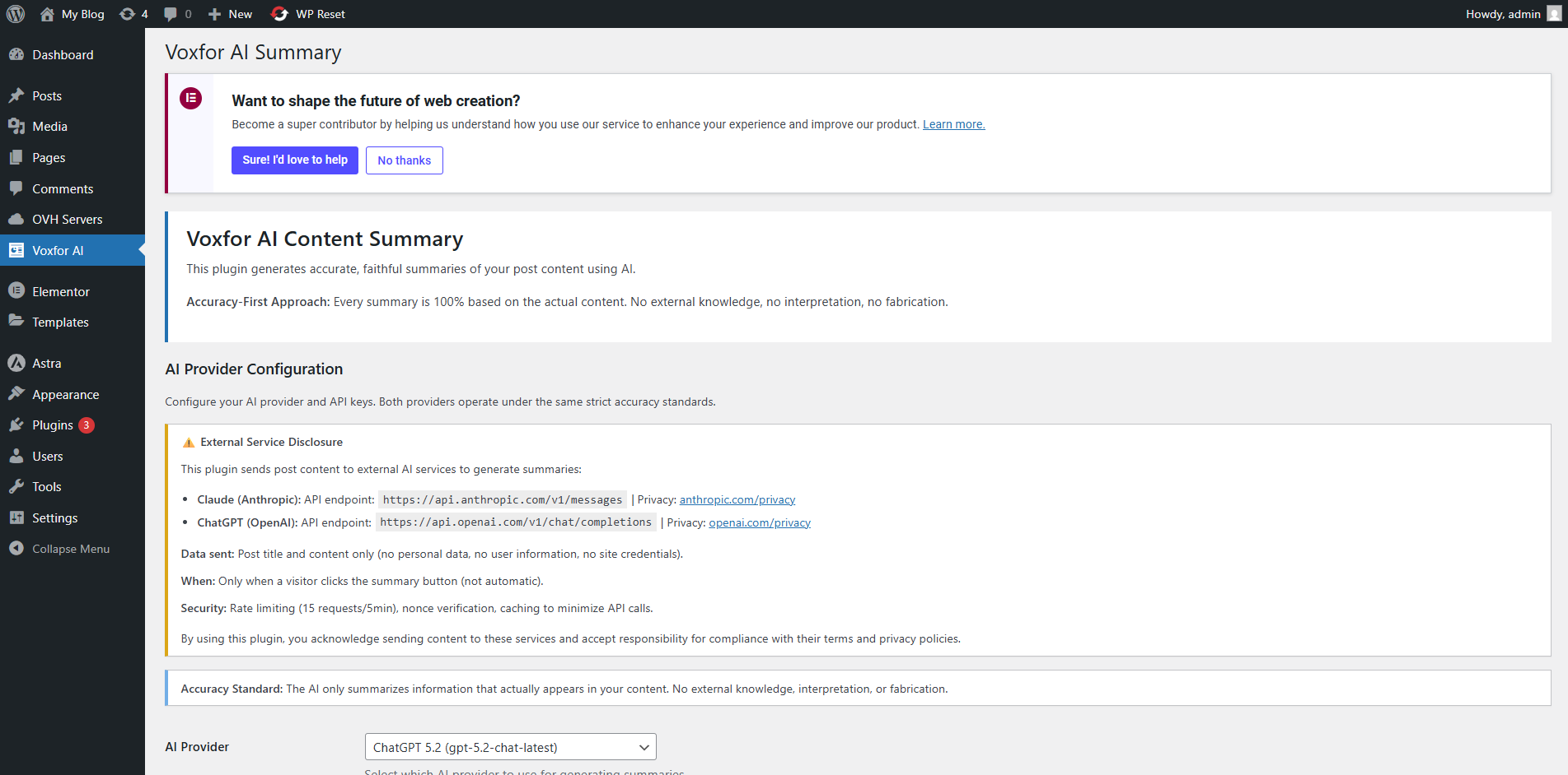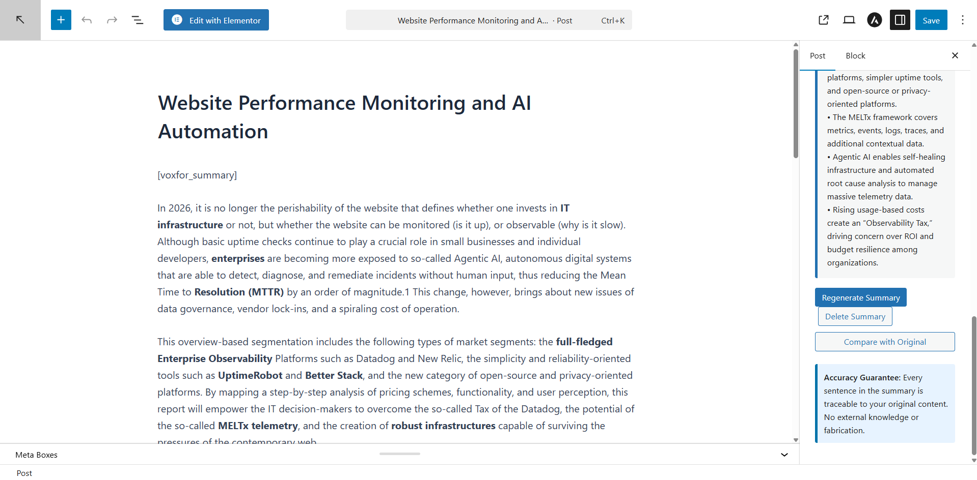 Voxfor AI Content Summary helps improve AEO (Answer Engine Optimization) by creating clear, accurate summaries directly from your WordPress content. The plugin generates faithful summaries based only on what is written in your post, making it easier for search engines, AI assistants, and readers to understand your content quickly.