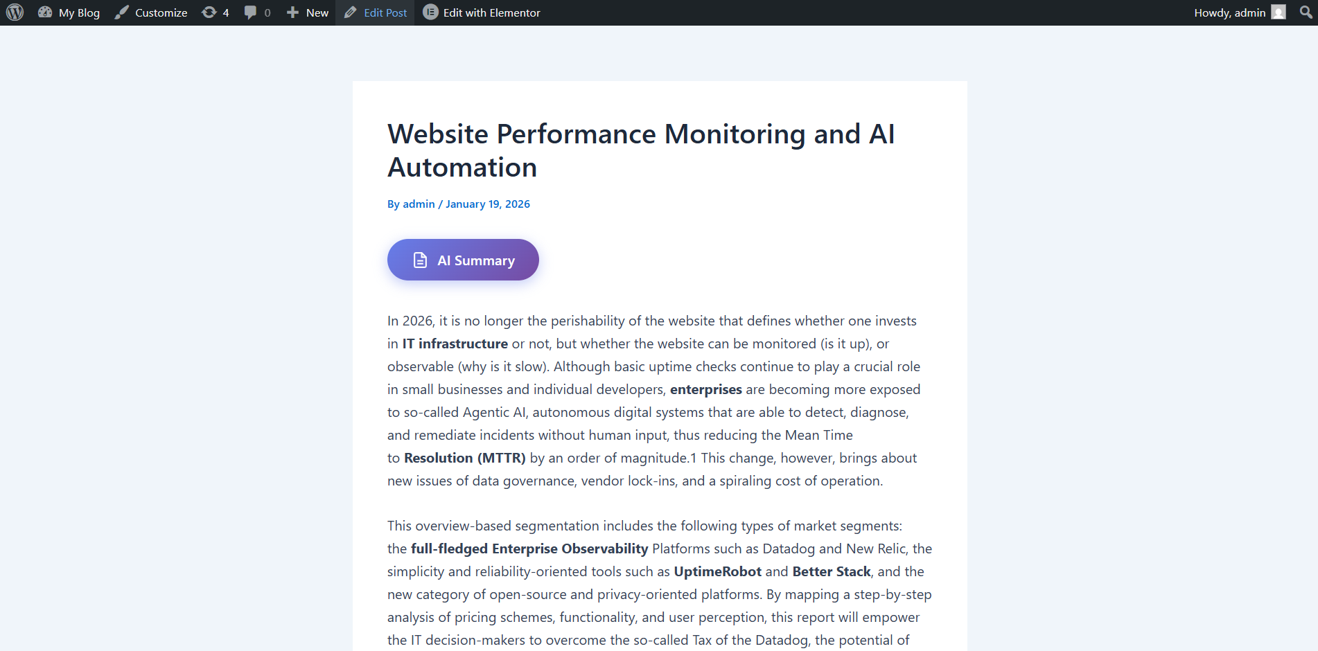 Summaries are cached in the database for fast loading, work with Gutenberg and custom post types, and can be displayed automatically, manually, or via shortcode. This plugin is lightweight, secure, and designed for sites that value accuracy, performance, and future-ready search optimization.