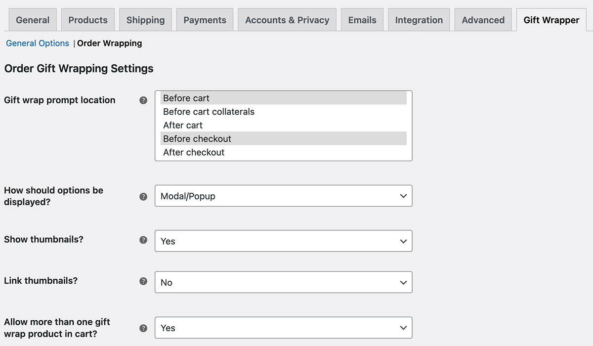 To prevent this happening, I recommend you set up your gift wrap products as WooCommerce “virtual” products (virtual but not downloadable). If setting them up as regular or variable products, make sure to arrange the shipping settings so they don’t incur surprise shipping costs.