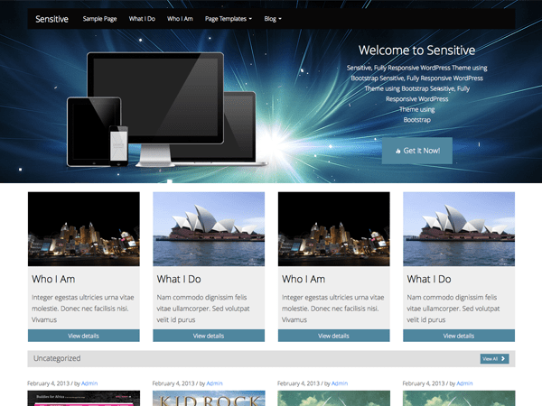 Fully Responsiven Multipurpose WordPress Theme using Twitter Bootstrap with Metro Styled Accent. This theme is will make your website adaptable with mobile devices. Theme Features: Custom Homepage Settings, 3 Page Templates, Custom Background Support, Search Engine Friendly.