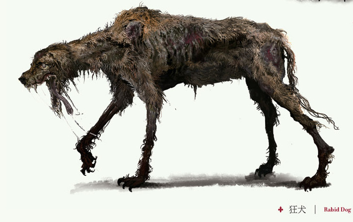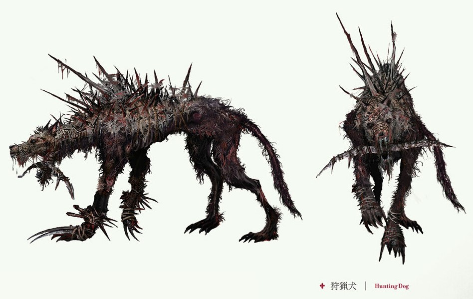 It wouldn't be a horror game, at least certainly not a Fromsoft horror game, without horrible dogs of some kind. The basic "rabid dog" is just an exceptionally nasty looking, emaciated canine with hideously matted fur, but it also comes in a "hunting dog" upgrade; this one is covered in metallic blades, needles and spines that look artificially embedded in its flesh, including a serrated, crescent blade held in its mouth like a set of tusks.