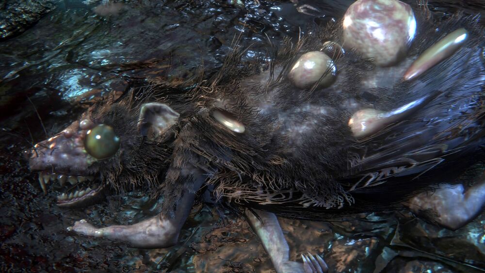 Finally, we have these horrible variant carrion crows with the heads of dogs, encountered only in the Nightmare of Mensis locale. I have to say the only thing worse than a huge greasy black bird oozing along the floor towards you is one with the face of a scabby wet dog with solid white eyes. In the context of Bloodborne it's nothing, really, but if you met this in the real world I think it would probably traumatize your brain a lot worse than just a big tentacle creature. With a big tentacle creature you can at least think "oh, okay, this is just some undiscovered space creature." When a huge bird with a dirty puppy dog face oozes up the sidewalk, that's when you might think "oh, okay, the devil and hell might be real then."