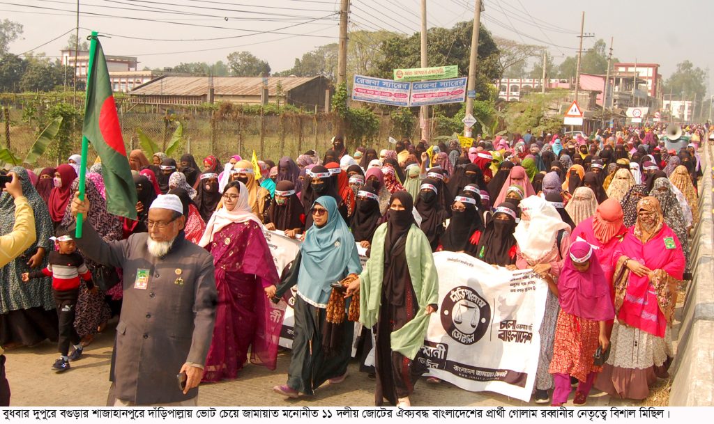 তিনি আরো বলেন, জোর দাবী করে প্রশাসনকে বলেন, যারা নারীদের হেনস্থা করতেছে তাদেরকে দ্রুত আইনের আওতায় নিয়ে আসতে হবে । আমরা আজ হোক কাল হোক এদেশে ইসলাম প্রতিষ্ঠা করবোই। জামায়াতে ইসলামী ক্ষমতায় গেলে নারীদেরকে ঘরের মধ্যে জোর করে আটকে রাখবে না। আল্লাহর আইন চালু হয়ে গেলে ব্যক্তি জীবন থেকে রাষ্ট্রীয় জীবন পর্যন্ত কল্যাণ হবে। জামায়াতে ইসলামী ক্ষমতায় গেলে নারীদের জন্য কর্মসংস্থানের ব্যবস্থা করা হবে। ফ্যামিলি কার্ডের নামে ভূয়া কার্ডের কথা বলে ভোট চাচ্ছে একটি দল। এগুলোর কোনো প্রয়োজন নেই। আমরা একমাত্র আল্লাহকে ভয় করি। কারো হুমকি ধামকিতে ভয় করি না। যারা নারীদের কে হেনস্থা করতেছেন তাদেরকে বলবো আপনাদের ঘরেও মা বোন আছে। এগুলো কাজ থেকে বিরত থাকুন। জামায়াতের বিরুদ্ধে মিথ্যা প্রোপাগান্ডা চালাচ্ছে একটি দল যে জামায়াতে ইসলামী বেহেস্তের টিকিট বিক্রি করতেছে। আমি তাদেরকে বলবো আমরা বেহেস্তের টিকিট বিক্রি করি না। এগুলো মিথ্যা প্রোপাগান্ডা থেকে সবাই সতর্ক থাকতে হবে। এবার পার্লামেন্ট হবে ইসলামের পার্লামেন্ট। শাজাহানপুর ও গাবতলী উপজেলা যে সমস্যা রয়েছে আমি যদি নির্বাচিত হতে পারি তাহলে এগুলো সমস্যা সমাধান করবো। ইনশাআল্লাহ।