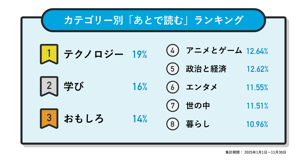 もっとも「あとで読む」タグの使用率が高かったのは、「テクノロジー」カテゴリーでした。
