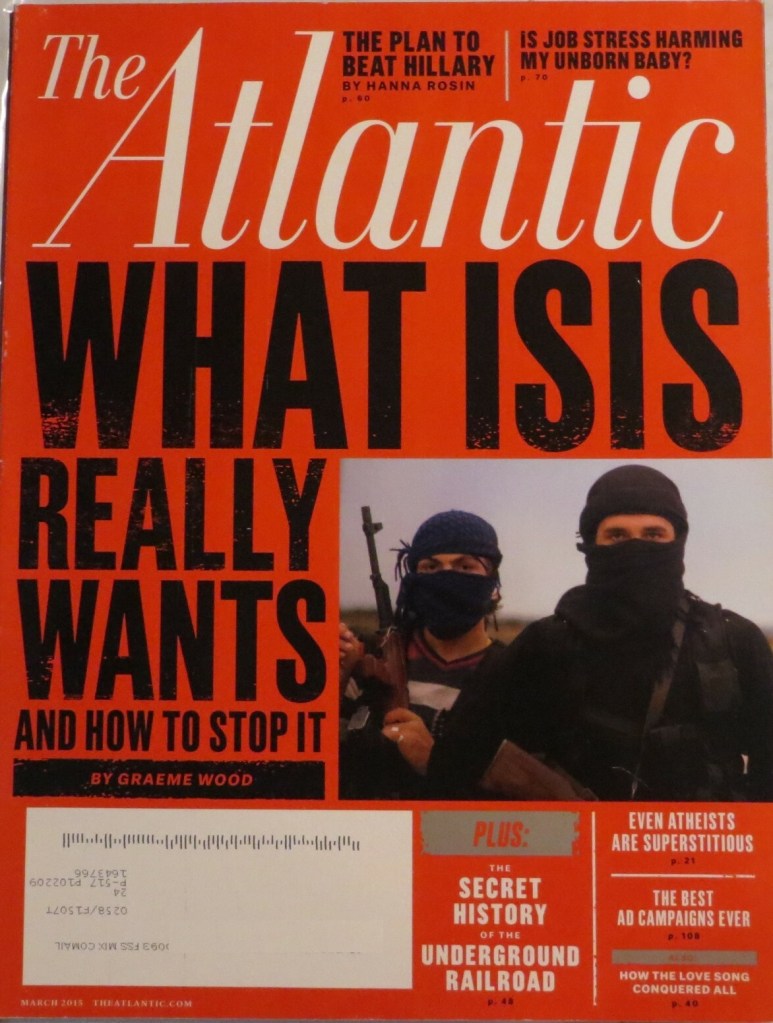 McCaslin recalled Bowie once telling him that “Blackstar” was about ISIS, and its recording coincided with ISIS’ peak territorial gains in Iraq, Syria, and Libya and its peak media attention (e.g., the March 2015 issue of The Atlantic, see above). Bowie never told this to anyone else involved in the sessions. He could have been having some interpretive fun (“here’s another clue for you all/ the Walrus was ISIS”), or talking through some ideas he’d later discard.