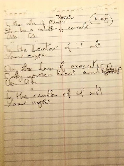Another trail to follow. On a sketch sheet of Bowie’s “Blackstar” lyric, there’s a parenthetical, “(Lucy),” in the margin of the first “villa of Allmen” stanza.