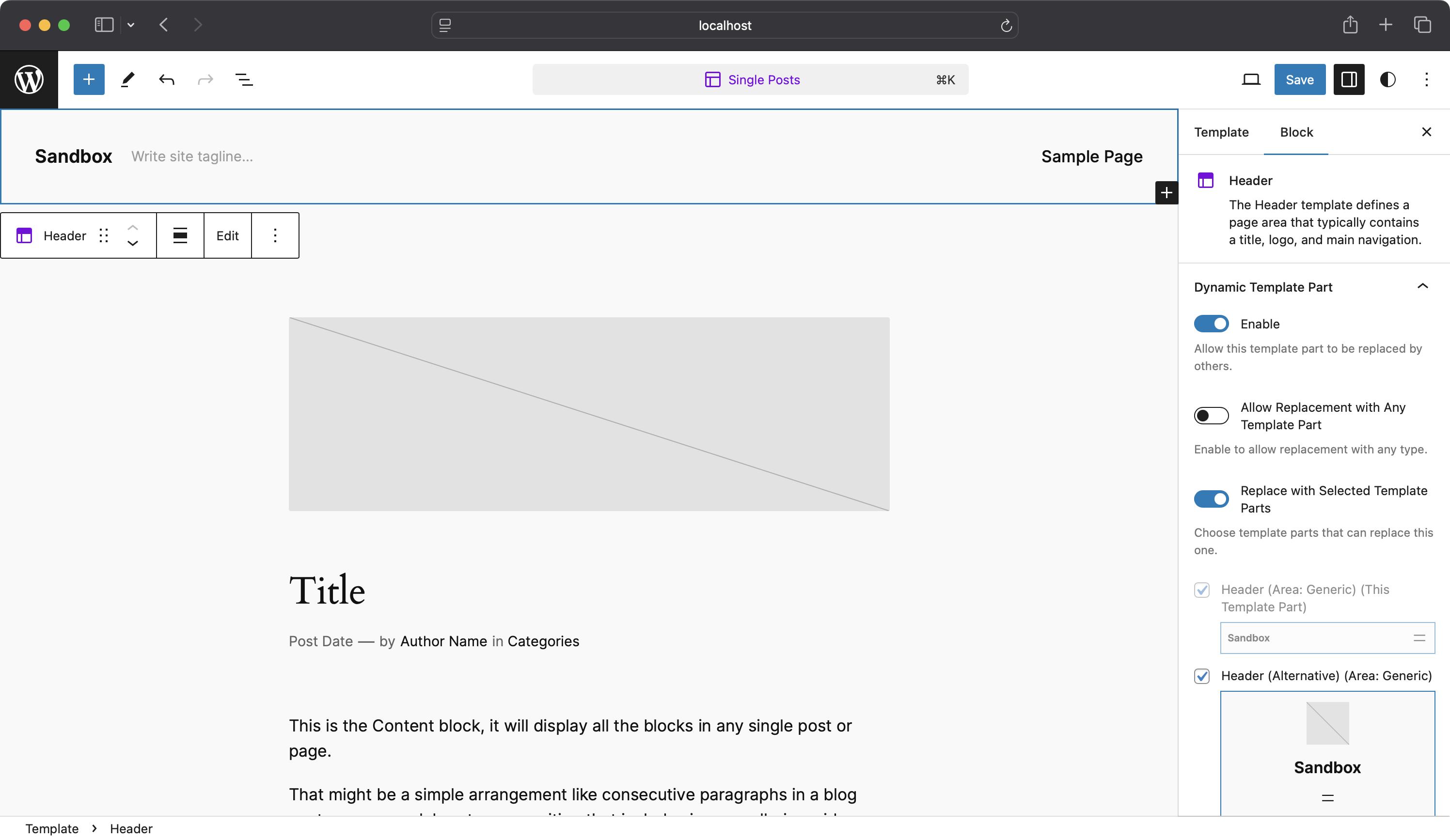 - Edit the Single Posts Template: Navigate to the Single Posts template and select the Header Template Part, and view the block sidebar.