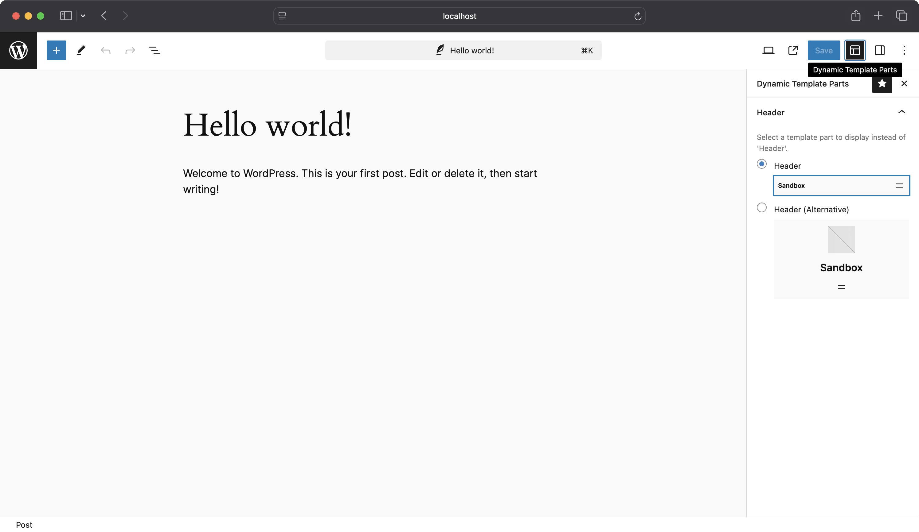 - Edit a Post and Access the Dynamic Template Part Sidebar: Open a post for editing and select the Dynamic Template Part sidebar from the editor interface.