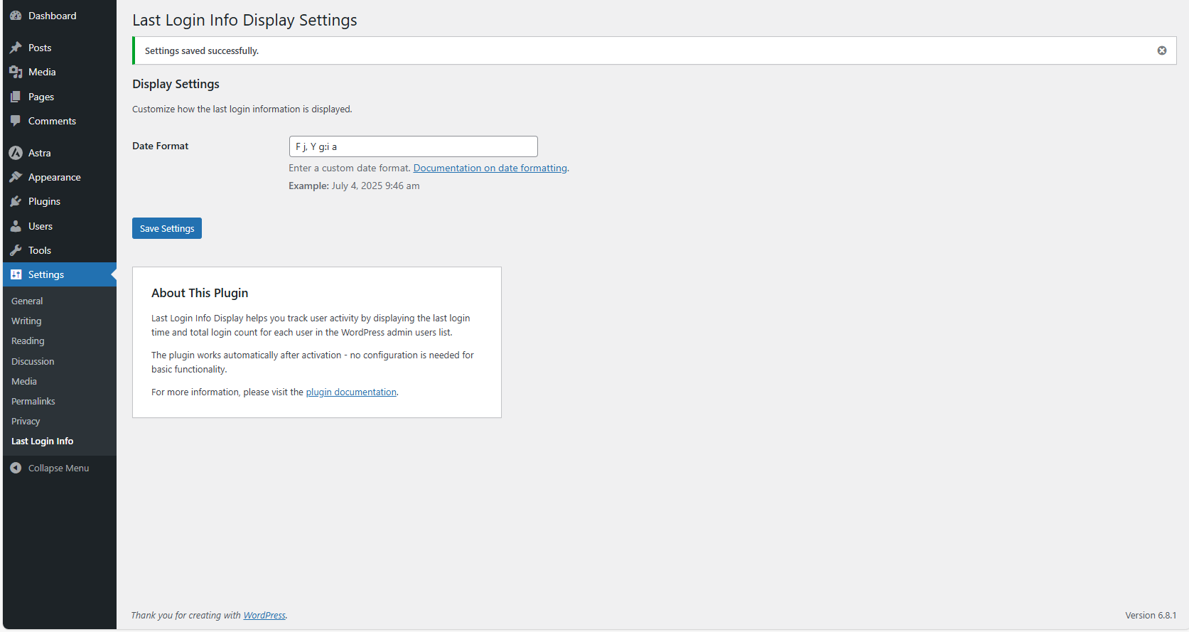 last-login-info-displayfolder to the/wp-content/plugins/directory - Activate the plugin through the ‘Plugins’ menu in WordPress