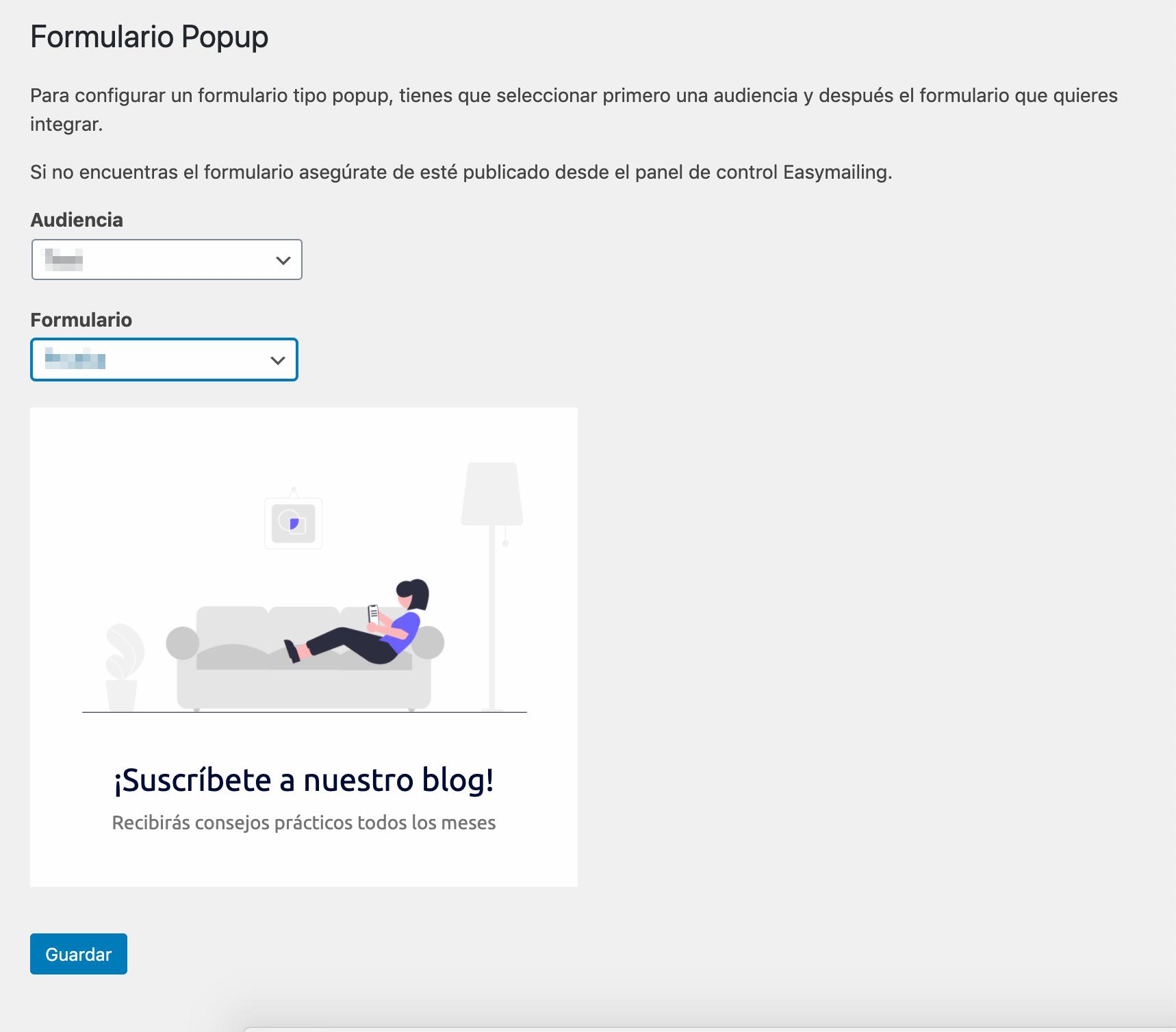 For additional information on how to configure the plugin, including integration with WordPress, visit our help center at https://ayuda.easymailing.com/hc/es/articles/360018193498-Integración-con-WordPress.