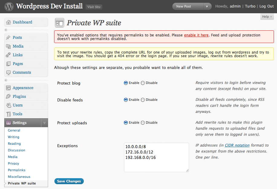 - Upload private-wp-suite.php to the /wp-content/plugins/ directory