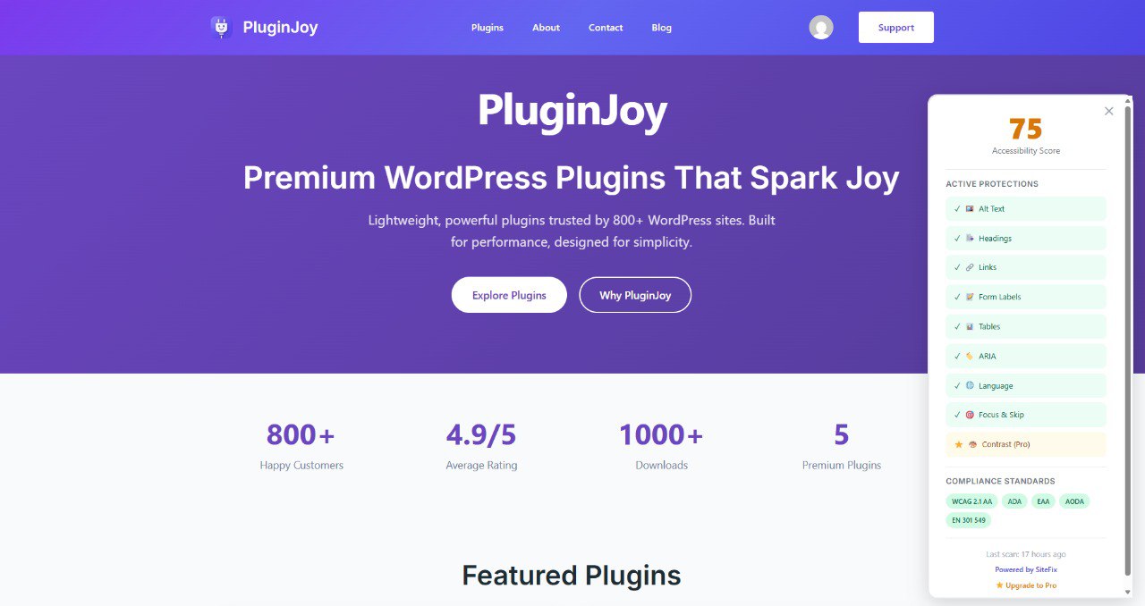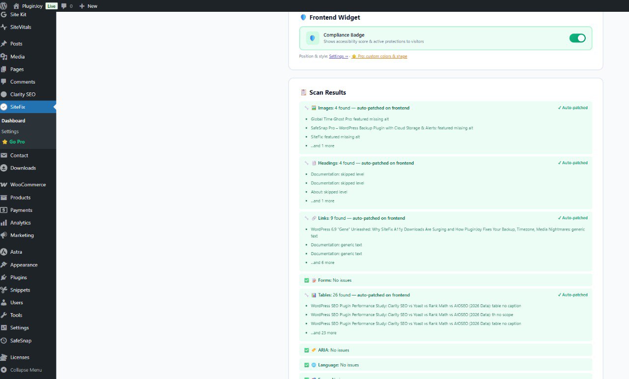 Free includes 8 automatic fixes and the compliance badge — enough for most sites to reach 90+ Lighthouse scores. Pro adds AI-powered alt text, advanced contrast fixing, PDF checks, downloadable compliance reports, legal templates, scheduled scans, and custom badge styling.