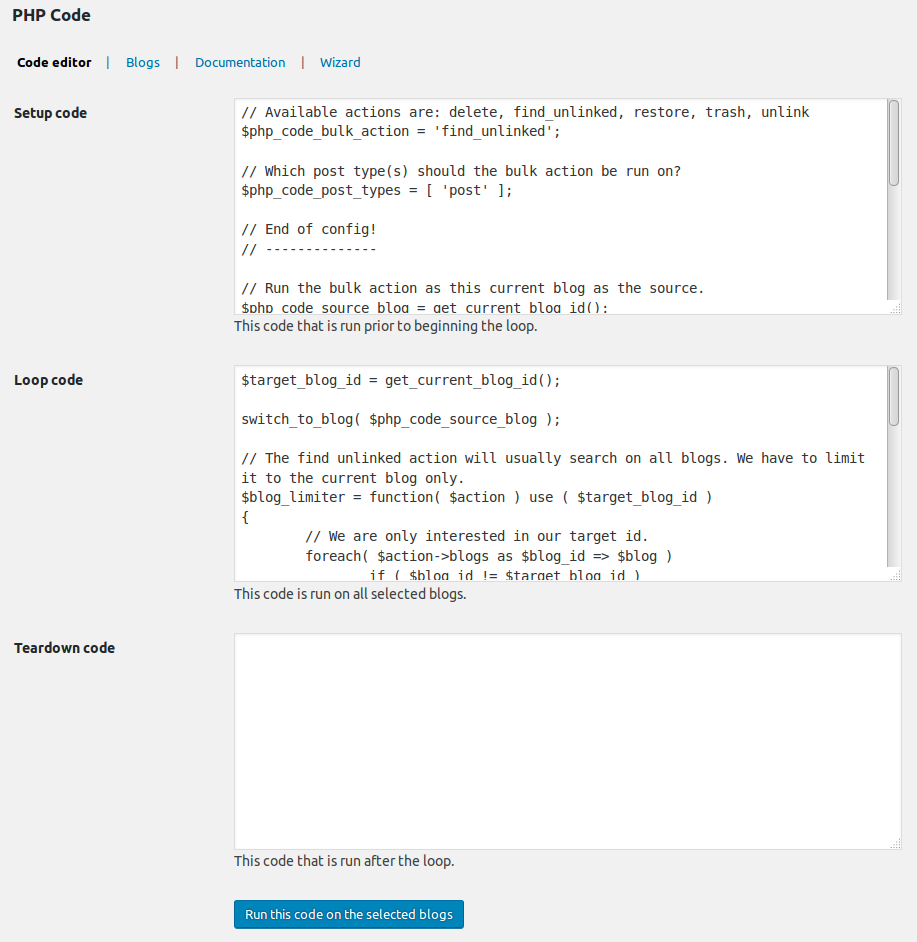 This add-on for Broadcast allows you to run custom code on selected blogs. Knowledge of PHP is required.