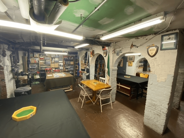 Moving down a narrow hall, we have our “monster game” table measuring 8’ x 8’ which plays host to large footprint multi-month games such as World In Flames or Pacific War. The three tables at the rear of the club (two at 5’ x 8’ and one at 5’ x 10’) all have removable tops, handy for hosting months-long games like Empires In Arms or a big RPG dungeon crawl miniatures campaign.
