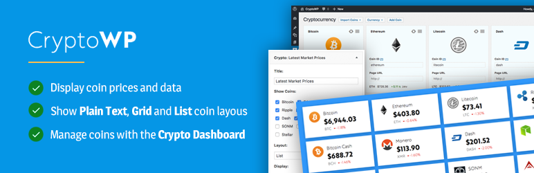 CryptoWP is a lightweight plugin that makes it easy to manage and display cryptocurrency coin prices and other information on your website.
