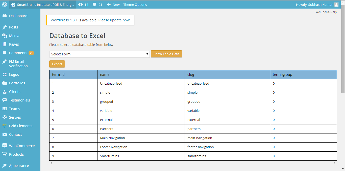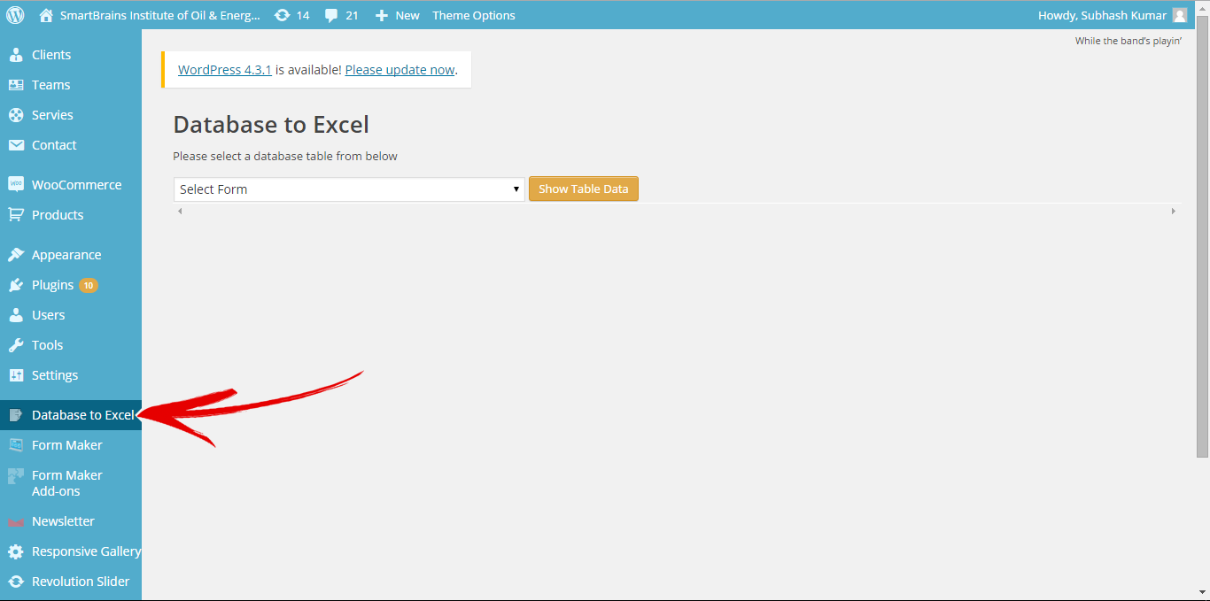 - Now, you will see a menu “Database to Excel” in admin panel, click on it.