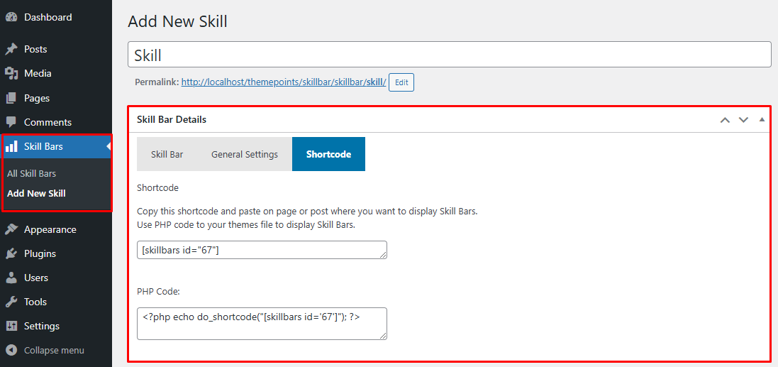 When active the plugin please Add New Skill and used this shortcode in your theme anywhere you want to display this Skill Bars.