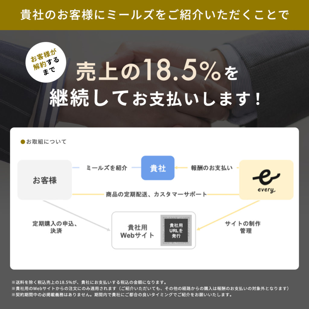 ミールズの販売パートナー制度への参加にご興味の有る方はこちらのフォームからお問い合わせください。フォーム送信いただくと、エブリー社の担当者より資料を送付させていただきます。