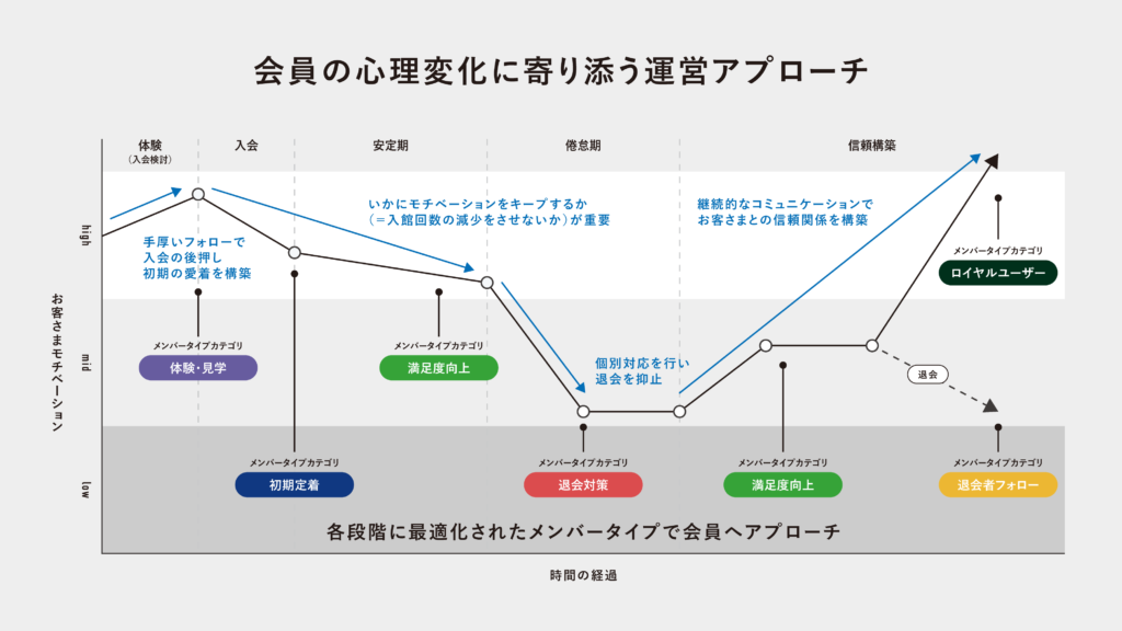 これにより「退会リスク会員」「VIP会員」「新規会員」といった重点フォロー顧客群が整理され、スタッフは日常業務で優先順位を付けやすくなる。さらに、退会リスク期に応じたアクション例を提示し、コミュニケーション機能と組み合わせることで、体験・入会・継続・退会防止といった会員ライフサイクル全体に対応できる。