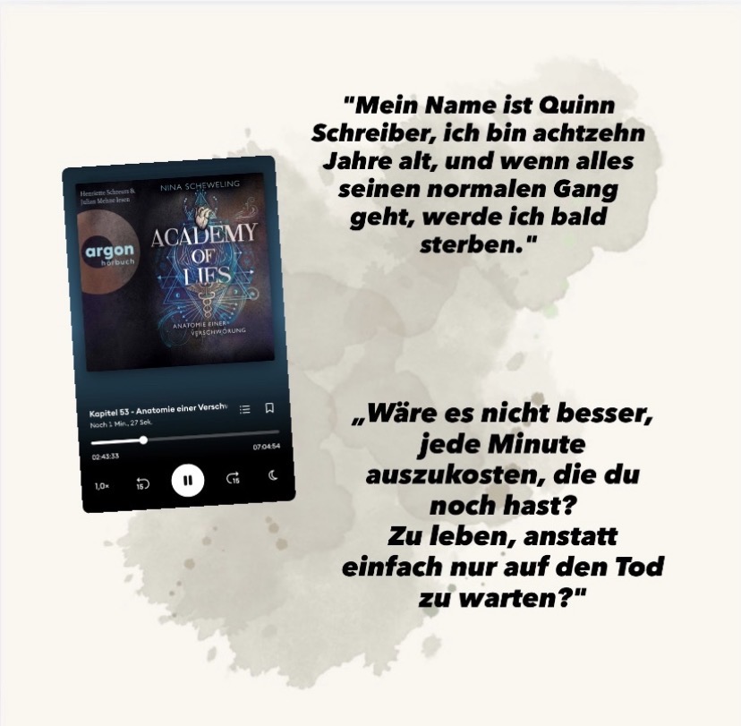 Das Setting einer Akademie mit Fokus auf Medizin passt perfekt, denn Quinns Spenderherz droht zu versagen, während Menschen um sie herum sterben. Noch brisanter wird es, als Hinweise darauf hindeuten, dass ihr eigener Bruder Flo in den Verdacht der Polizei gerät und plötzlich verschwindet. Die Stimmung ist intensiv, geheimnisvoll und manchmal richtig düster – genau das, was mich von Anfang an gefesselt hat. Ich wollte unbedingt herausfinden, was wirklich hinter all den mysteriösen Ereignissen steckt.