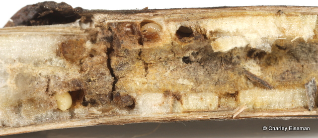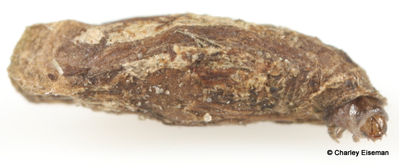 I ended up getting only parasitoid wasps from the larvae we collected, but we also collected one cocoon along with the mines, and an adult emerged from it. Here’s the cocoon with the empty pupal skin poking out of it…