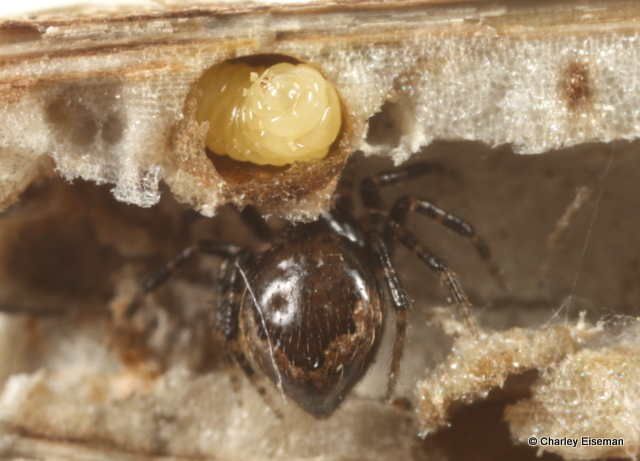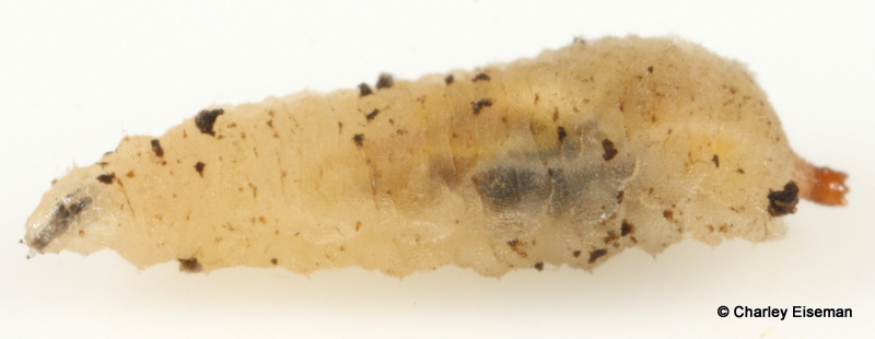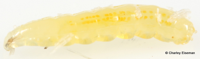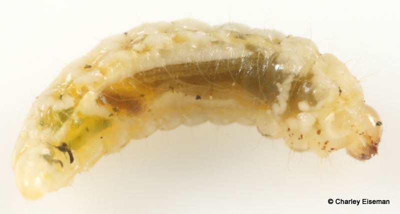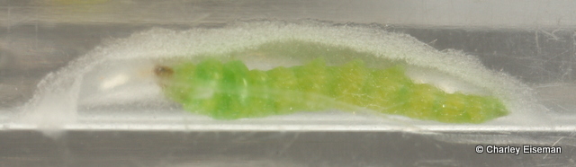 When finished feeding, the larvae exited their mines and spun cocoons. One did so at the bottom of a rearing vial, so I was able to get a look at the larva inside its cocoon through the side of the vial: